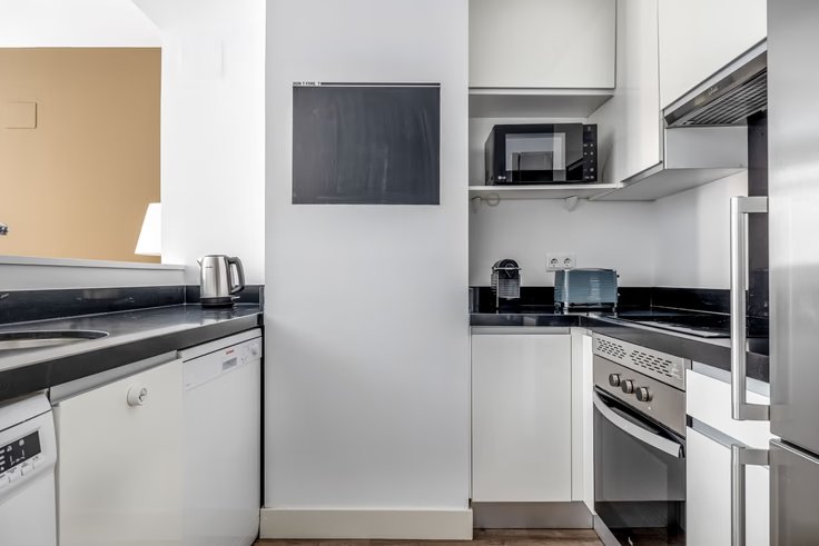 Thoughtfully designed with bespoke finishes, modern furnishings, and a fully-equipped kitchen, you’ll enjoy that “I’m home” feeling with this Evergreen apartment. Whether you’re lounging in your beautiful living room streaming the latest and greatest entertainment on the smart TV or premium wireless speaker, or getting some well-earned rest on the superior quality mattress with luxury linens, you’ll fall in love with everything this Malasaña apartment has to offer.